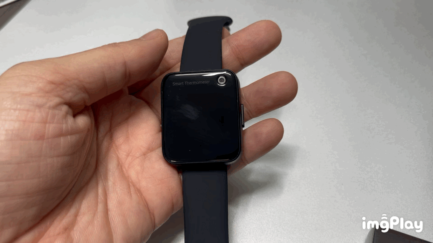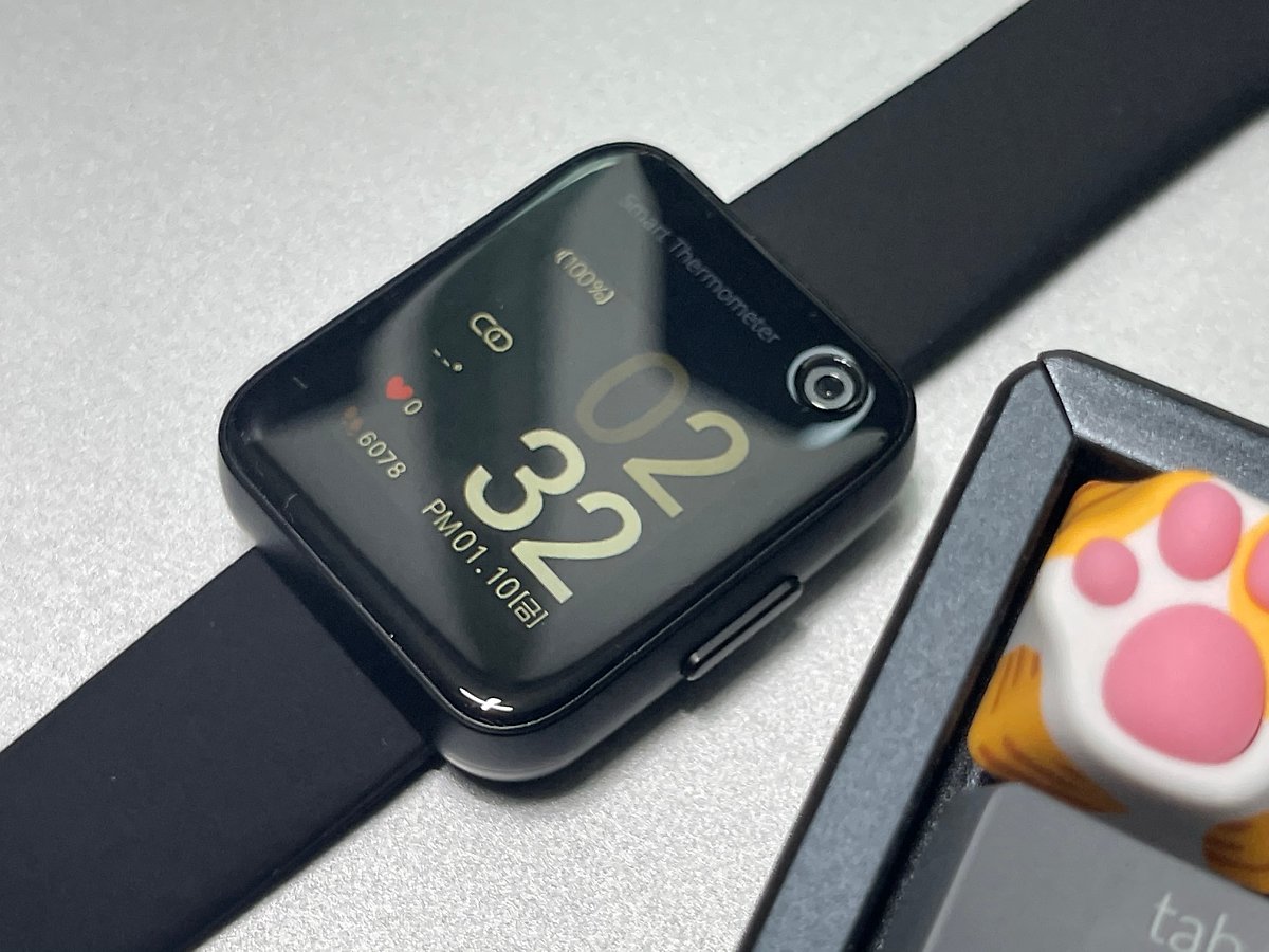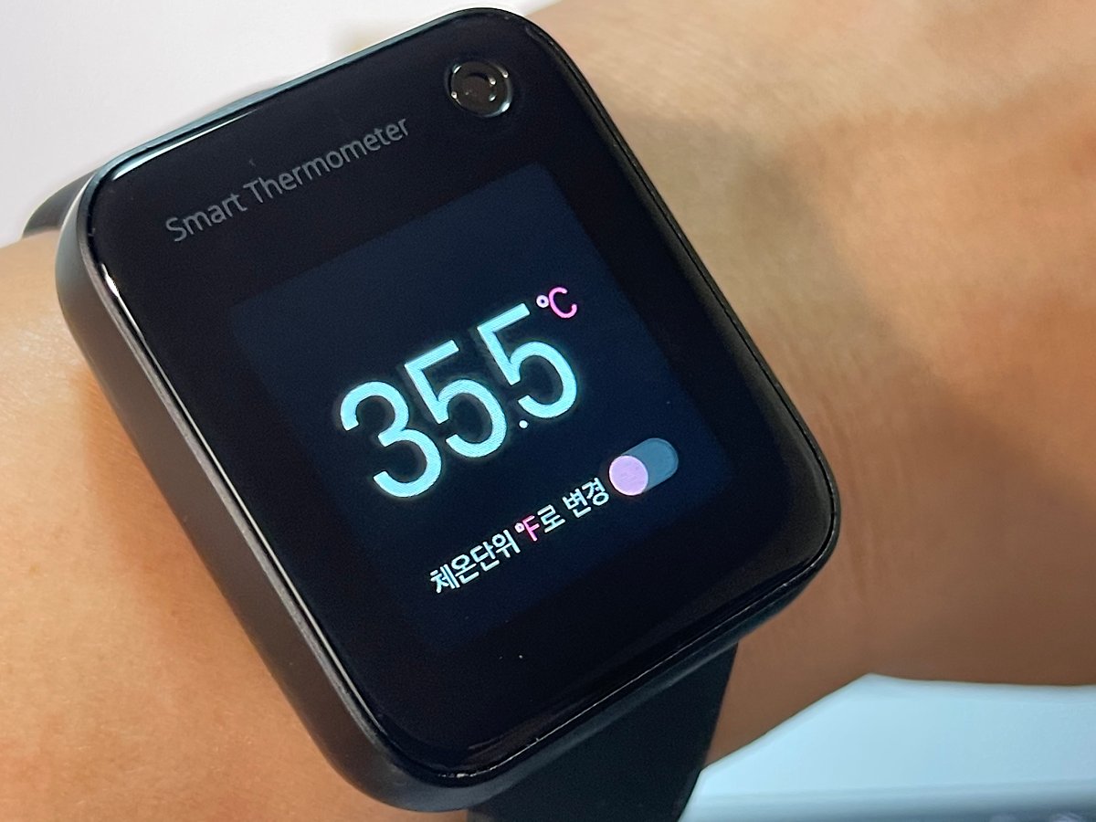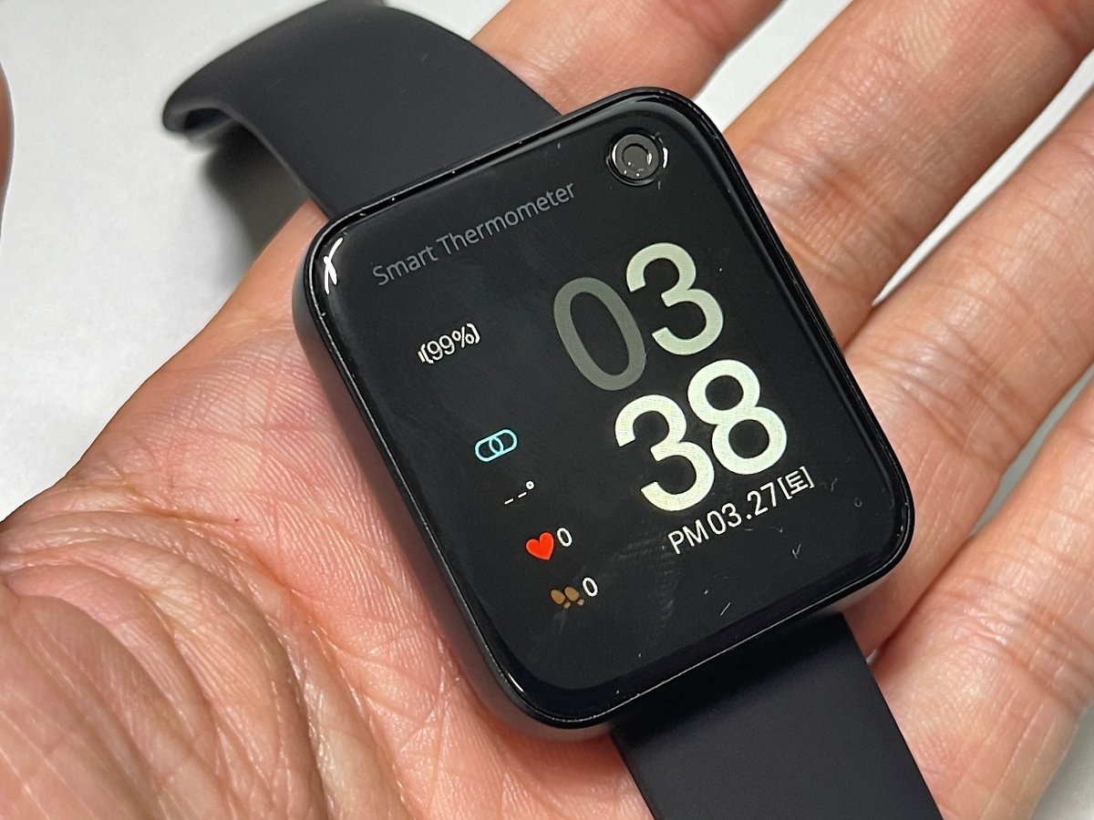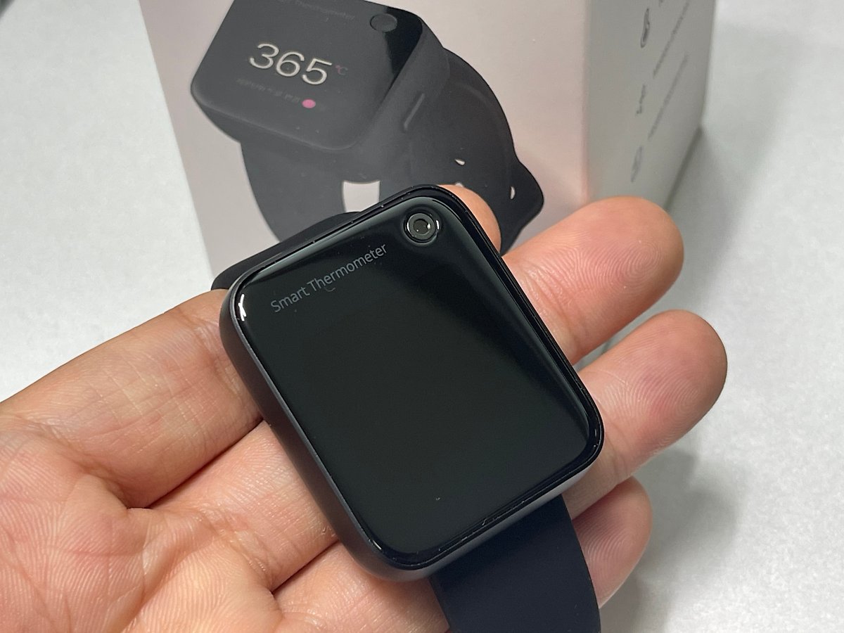 디스플레이 크기는 일반적인 네모난 스마트 워치들과 비슷한 1.3인치 사이즈 입니다. 그리고 디스플레이 상단에 적혀있는거 보이시죠. Smart Thermometer 라고... 스마트 체온계가 요 제품의 주요 특징이죠. 그리고 그 오른쪽 옆에 마치 센서같은 동그란게 보이네요. 요걸로 측정하나 봅니다.