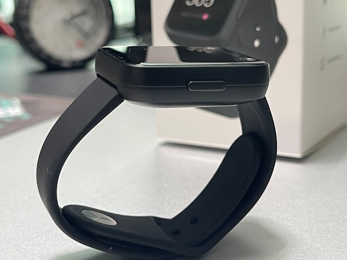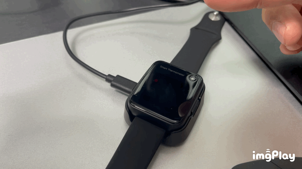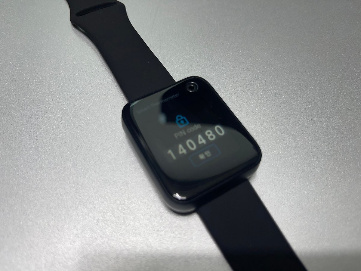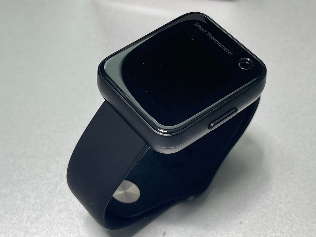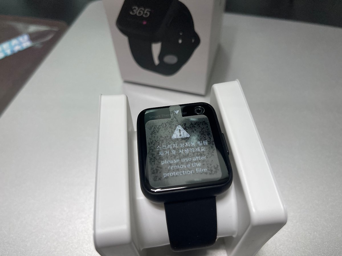 디스플레이 크기는 일반적인 네모난 스마트 워치들과 비슷한 1.3인치 사이즈 입니다. 그리고 디스플레이 상단에 적혀있는거 보이시죠. Smart Thermometer 라고... 스마트 체온계가 요 제품의 주요 특징이죠. 그리고 그 오른쪽 옆에 마치 센서같은 동그란게 보이네요. 요걸로 측정하나 봅니다.