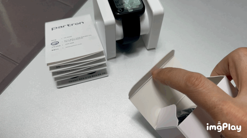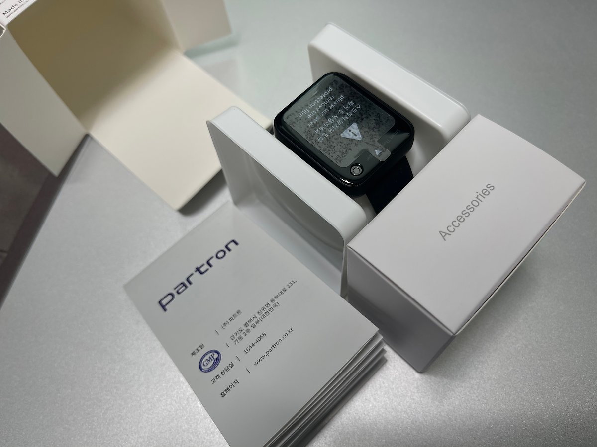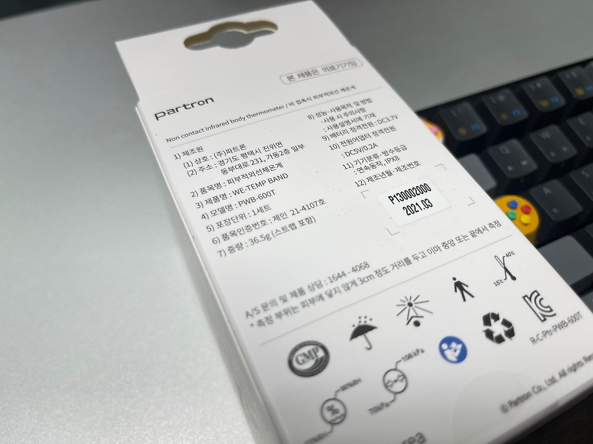 그리고 패키징 뒷면에는 요렇게 파트론(Partron)이라는 회사와 제품에 대한 자세한 정보가 표시되어 있네요. 36.5g 무게(스트랩 포함), IPX8 방수 등급, 충전 전력 등을 확인할 수 있고 체온을 측정하는 방식도 간단하게 적혀있습니다. 요런건 직접 실행해봐야 알겠죠. 일단 패키징은 요정도로...