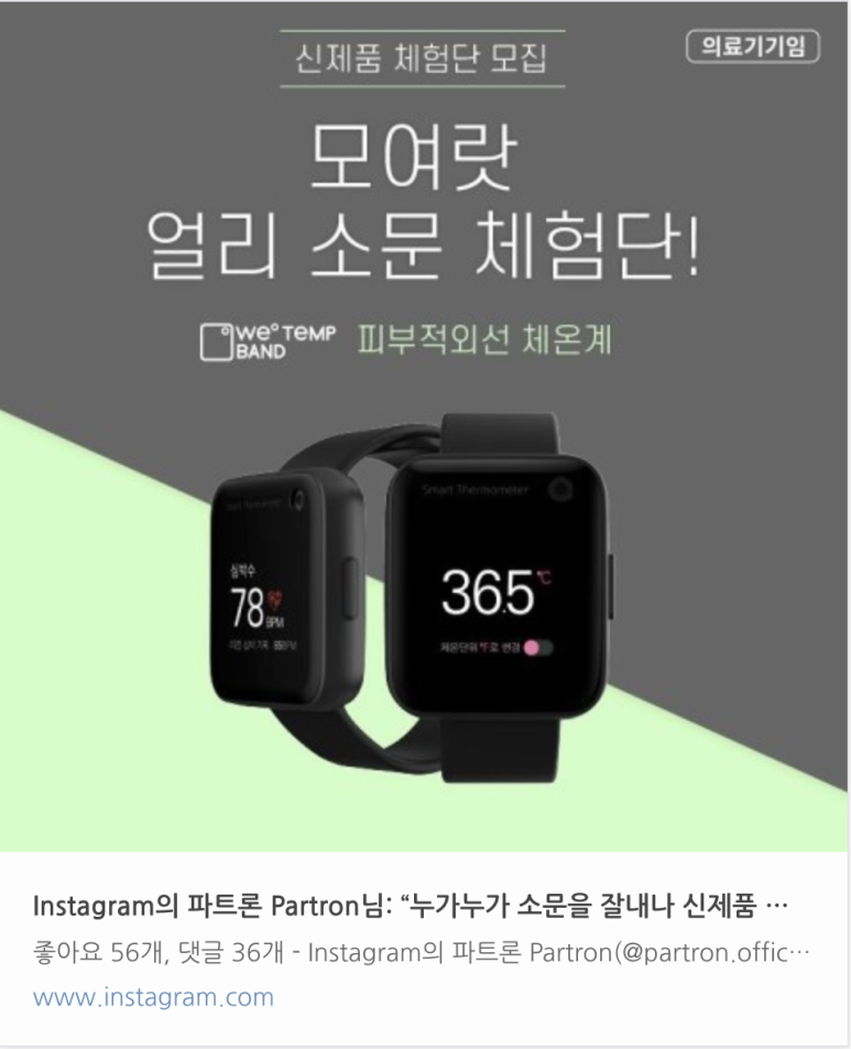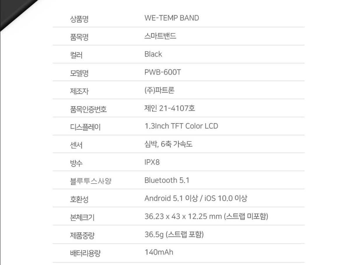 ▶ We Temp 밴드 제품의 체온 측정 부분을 제외한 나머지 스마트 밴드 기능(심박 측정, 운동 확인 등)은 의료기기 기능이 아닙니다. 요건 알아두시면 좋을거 같네요. 체온 측정 부분만 의료기기 기능입니다.