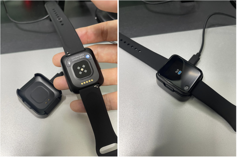 아시죠? 요런 제품은 항상 처음 사용하기 전에 배터리 완충 상태로 만들고 시작하는거... 당연히 예상하는거 처럼 충전 크래들과 We Temp 밴드는 마그네틱 방식으로 착! 하고 달라붙도록 되어 있고 충전을 시작하면 요렇게 잠시 배터리 상태가 표시됩니다. 그럼 완충때까지 잠시 놔두고...
