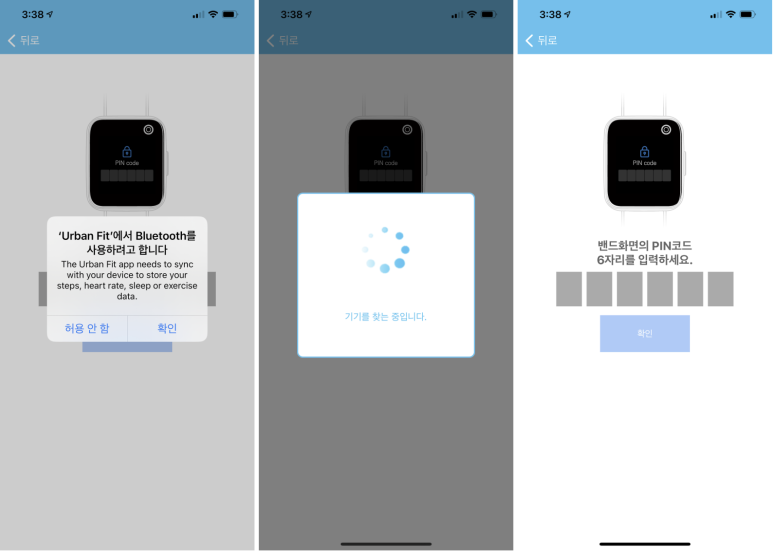 모바일 앱과 밴드는 블루투스로 연결이 되고 주변에 We Temp 밴드를 찾는 과정이 진행 됩니다. 어라? PIN 코드를 넣어라고 하네요. 놀라지 마세요. 밴드 화면으로 이동해서 코드를 확인하시면 됩니다.