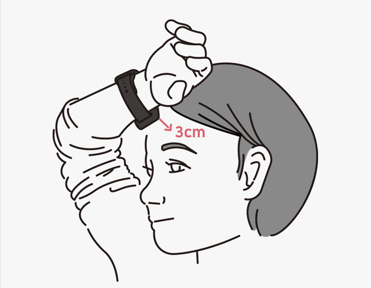 그리고 이마에 3cm 정도 떨어뜨려서 온도 센서를 가져다 대면 3초 정도 측정 합니다.