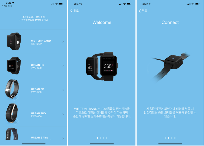 모바일 앱에 대한 UI는 꽤 괜찮아 보입니다. 단순하고 간결하면서 정보의 전달성도 좋아 보이네요. 파트론이라는 회사에서 판매하는 제품이 We Temp 밴드 말고도 다양하게 있나 봅니다. We Temp 밴드 선택하고 다음, 다음, 다음 하시면 됩니다.