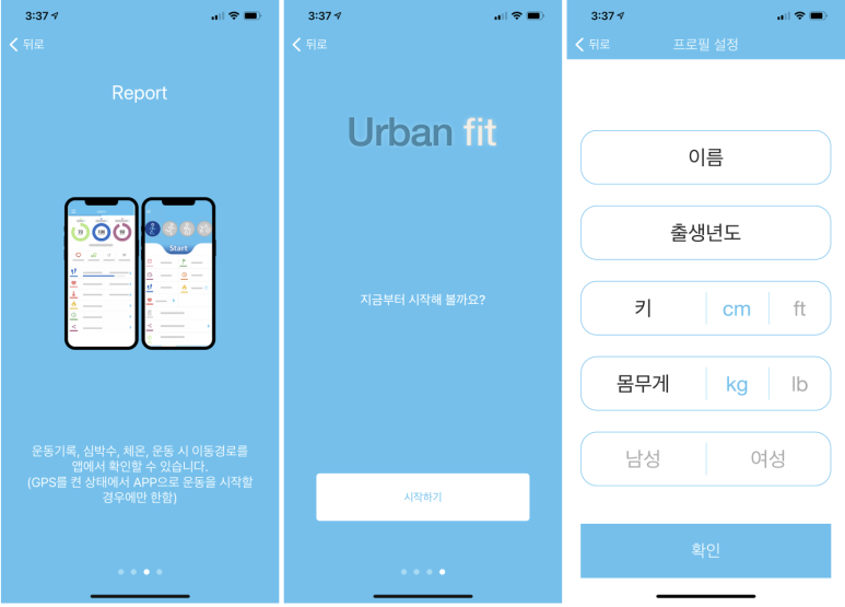 간단하게 We Temp 밴드에 대한 주요 특징들을 소개하고 있는 화면을 지나면 시작하기 버튼을 만나보실 수 있고 프로필 설정을 위한 정보를 입력하는 화면이 나타나네요. 입력하고 다음...
