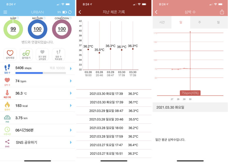 모바일 앱에 대한 세부 내용과 밴드 관련 자세한 사용 방법은 별도의 사용기에서 작성하도록 하고 오늘 마무리는 대략 3~4일 정도 사용해본 후 모바일 앱을 확인한 모습입니다. 요렇게 표시가 되네요. 자세한 사항은 사용기에서 다룰테니 요렇게 생겼구나 정도로만 봐주세요.