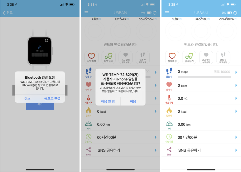 거의 다 된거 같습니다. 블루투스 연결이 완료되고 알림 표시도 허용하고 요렇게 앱의 초기 화면을 만나보게 될 겁니다. 아직 사용을 하지 않아서 그런지 모든 수치들이 초기 값으로 보여지네요.
