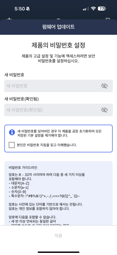 그리고 가급적 최신 펌웨어를 적용하시는 거 권장 드리고... 프린터 펌웨어 업데이트할 때 비밀번호를 요청하더라고요. 기본 비밀번호는 프린터기 뒤쪽에 보시면 복잡한 값으로 설정되어 있는 거 확인하실 수 있습니다. 이걸 본인이 원하시는 비밀번호로 규칙에 따라 변경해 주셔야 합니다. 그러면 펌웨어까지도 업데이트하시고 이제 편하게 사용하시면 됩니다.