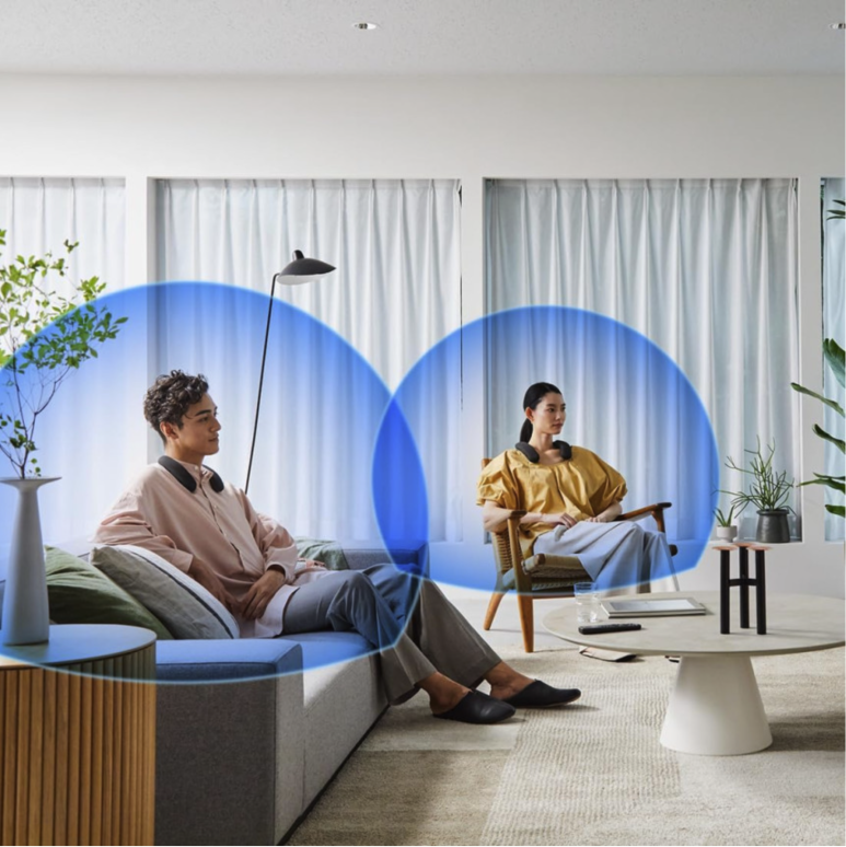 그냥 어깨에 걸쳐서 착용하는 방식이라 소파뿐만 아니라 침대에서도 편하게 기대어서 어깨에서 들려오는 사운드를 느끼면 되는 겁니다. 아마 빔프로젝터 같은 거 활용해서 침대에 기대어 편하게 즐기시는 분들도 충분히 사용할 수 있겠습니다.