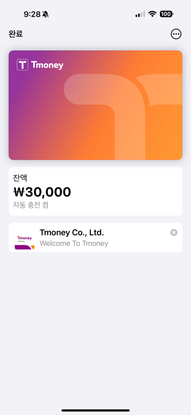 가지고 있는 티머니 카드를 등록하는 게 아닌가 봅니다. 바로 금액을 선택하도록 되어 있네요. 적당히 한 달 정도 사용할 금액을 등록하고 기존에 등록된 현대카드를 이용하여 애플 페이로 충전이 되는 방식이군요. 결제를 마치고 티머니 카드가 지갑 앱에 추가되었습니다.