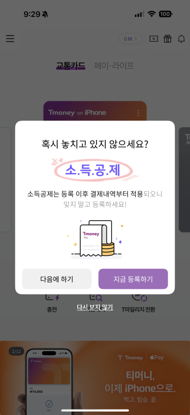 아~~~! 소득공제 등록도 잊지 마시고, 교통카드 항목에 방금 지갑 앱에 추가된 티머니 교통카드가 보입니다. 충전 잔액도 표시가 되네요. 그리고 모바일티머니 앱에서도 충전이 가능한가 봅니다. 하단에 충전 메뉴가 보여서요. 그리고 애플 워치에서도 티머니를 등록해서 사용할 수가 있다고 합니다.
