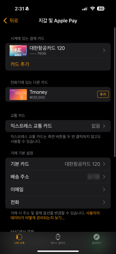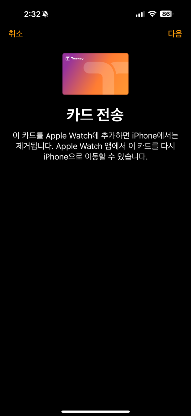 정보를 좀 더 찾아보니, 온디바이스 기기에서 각각 관리를 하기에 애플 워치도 별도로 티머니를 추가해야 한다고 합니다. 좀 전에 아이폰에서 했던 과정과 동일하기에 크게 어렵지 않네요. 바로 완료하였습니다.