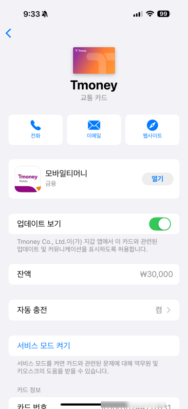 새로이 등록된 티머니 카드의 세부 정보를 살펴봅니다. 잔액, 자동 충전, 카드 번호 그리고 익스프레스 모드 등 세부 내용을 확인하실 수 있습니다.
