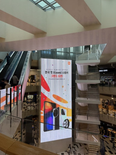 네... 저기 보입니다. 에스컬레이터 올라오면서 바로 보이더군요. 샤오미 로고가 주변 색상과 대비가 되어 두드러지게 드러나네요. 근데, 애플 스토어를 자주 봐서 그런지... 아님... 지난번 출장 두바이에서 봤던 샤오미 스토어랑 비교가 되어서 그런지...