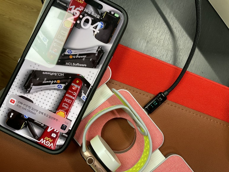 그러고는 편하게 아이폰을 가로 거치 형태로 부착해 보세요. 충전도 하면서 가로 거치 방식으로 영상을 보는 것도 가능해집니다. 물론 애플 워치 충전 파트도 세워서 애플 워치 충전까지도 가능해집니다. 안타깝게도 에어팟 충전은 마그네틱 방식이 아니라서... ㅠㅠ
