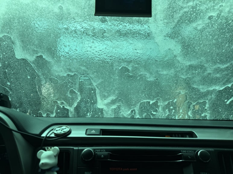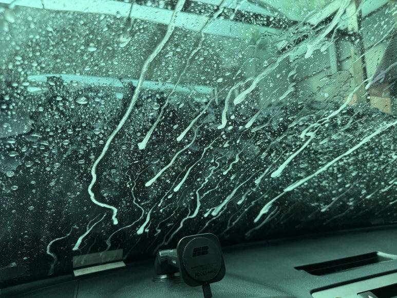 글을 작성하는 지금 시점까지 대략 2주 가까운 시간 동안 경험하고 글 작성을 위한 준비를 하는데, 딱 하나 폭우가 쏟아지는 날 와이퍼 테스트 부분을 경험하지 못하였습니다. 그래서 아쉽지만, 폭우 대신 자동차 세차장 진행 중에 사진 한 컷 찍어서 올려봅니다.