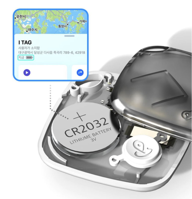 요건 사진을 가져와서 말씀드릴게요. 배터리 관련 이야기인데, 에어태그와 동일하게 CR2032 건전지를 사용하고 쉽게 교체도 가능합니다. 대략 사용 시간은 에어태그와 동일한 1년가량이라고 합니다. 에어태그는 배터리 상태 표시 기능이 없지만, 아이태그는 배터리 상태를 확인하고 쉽게 교체 시기를 알 수 있겠습니다.