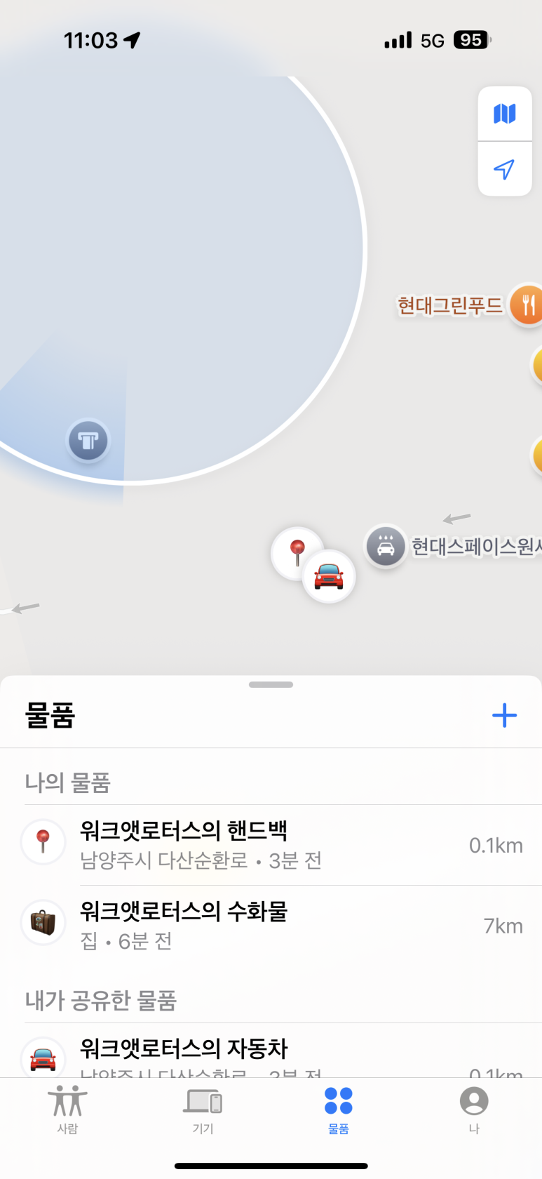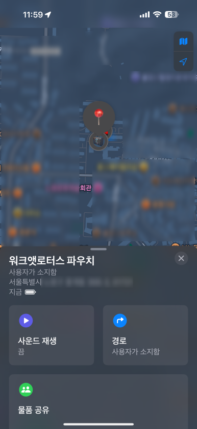 제가 있는 지상 영화관 위치에서도 에어태그와 동일하게 위치 정보가 파악이 되고 있습니다. 거의 차이가 없이 위치 정보 확인이 가능하더군요.