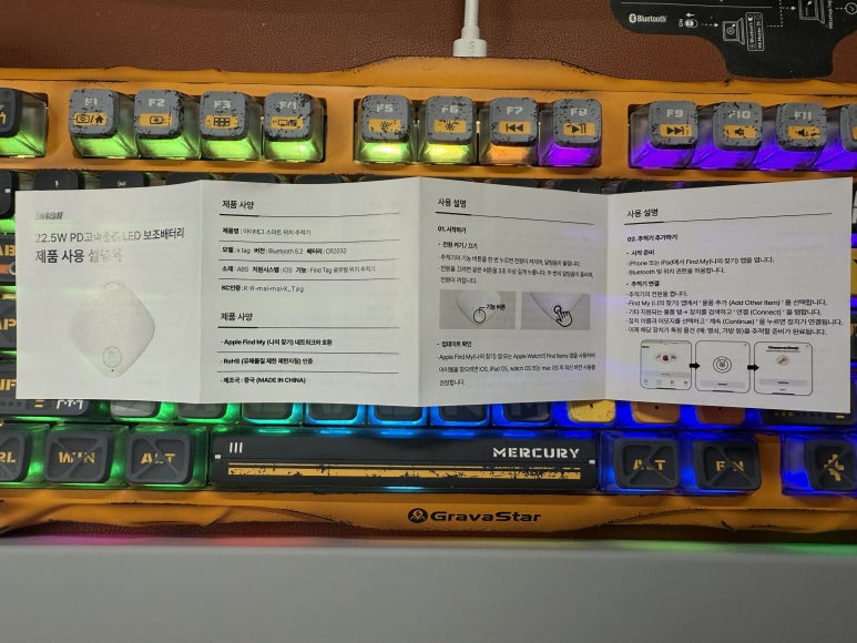 뭐, 이미 애플 에어태그를 사용해 본 경험이 있기에 크게 어려움은 없겠지만, 그래도 어떤 특징들이 있는지, 사용에 주의할 점은 없는지 설명서도 찬찬히 살펴봅니다. 음... 아래 페이지에는 그래도 그림과 함께 설명이 적혀있는데, 뒷면으로 넘어가면 온통 텍스트라 보기에 좀 불편합니다. ㅠㅠ 노안이라...
