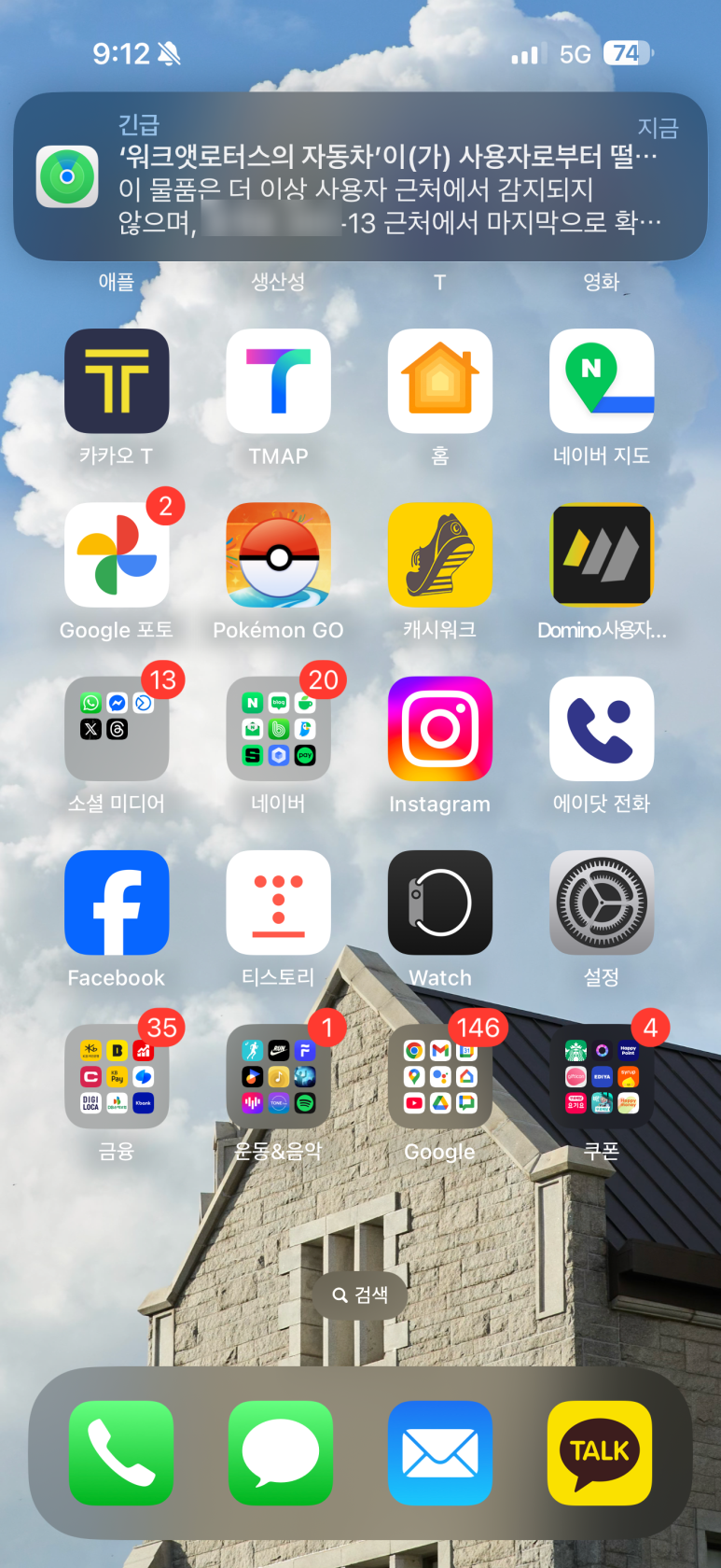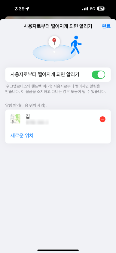 아이태그 역시 보시는 거처럼 차량에 두고 제가 밖으로 나와서 점점 멀어지게 되면 분실 방지 알림 메시지가 나타나게 됩니다. 다만, 집과 같이 자주 위치하는 곳의 경우 알림을 받지 않도록 제외하는 기능이 있습니다. 여기다가 새로운 위치를 등록해두시면 이곳에 두고 멀리 떨어지더라도 안내 메시지를 나타내지 않습니다.