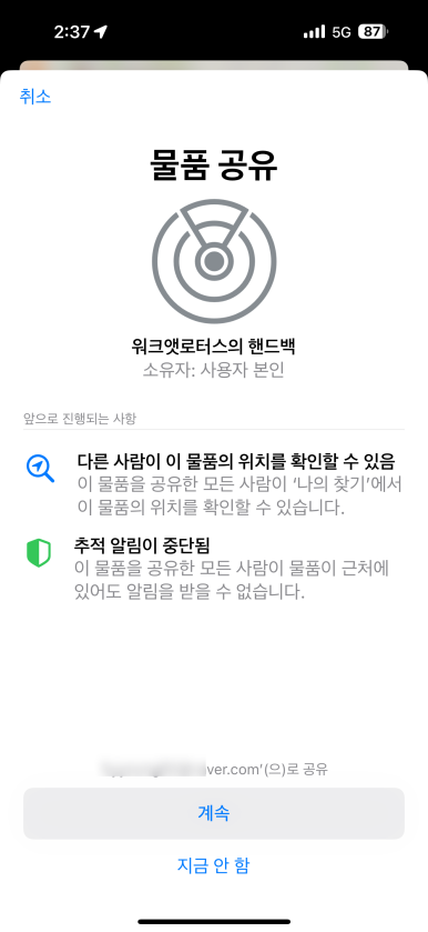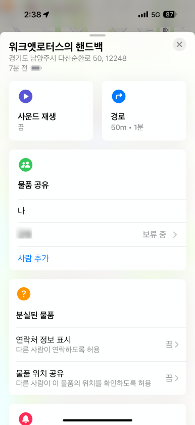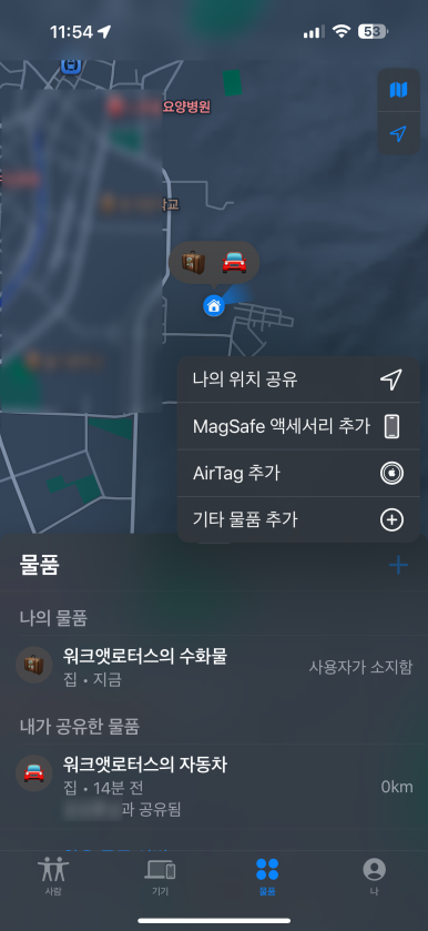 그리고 물품 공유 기능도 동일하게 제공합니다. 물품 공유 메뉴에서 사람 추가를 누르고 장여사를 추가하였고, 잠시 후 장여사가 수락을 하면 물품 공유 대상에 같이 나타나게 되고 장여사 역시 나의 찾기 앱에서 확인할 수 있게 됩니다.
