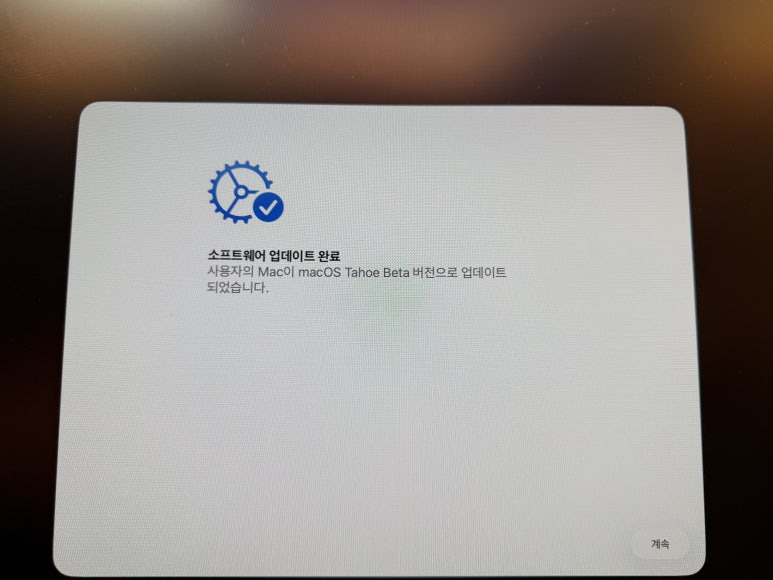 비밀번호 입력하고 다음으로 넘어가니, 요렇게 소프트웨어 업데이트가 완료되었다고 친절하게 알려줍니다. 아래 오른쪽에 계속 버튼 보이시죠. 이거 누르시고 다음으로 넘어갑니다.