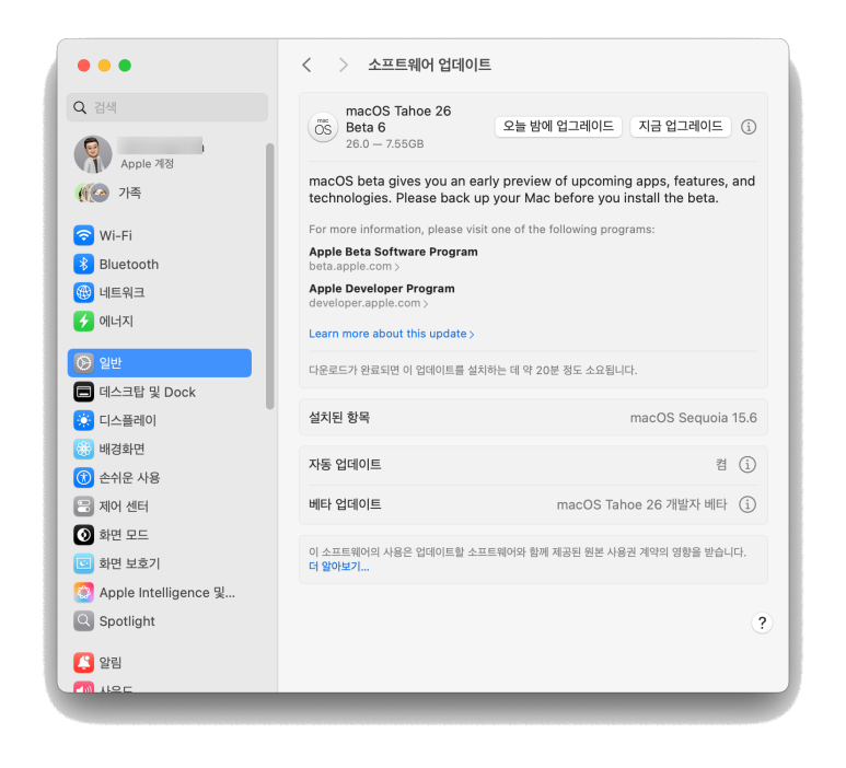 이미 이전에도 macOS 베타 버전을 적용한 적이 있어서 그런지, 환경설정에서 소프트웨어 업데이트에 베타 업데이트 항목을 누르니 macOS Tahoe 26 공개 베타랑 개발자 베타 두 가지 항목 모두 나타나더라고요. 잠시 고민하다가, 그냥 개발자 베타로 가기로 하였습니다.