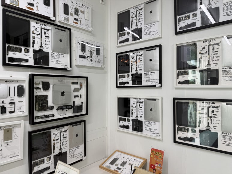 입구 들어서서 왼쪽을 둘러보시면... 작업하는 공간도 있지만... 요렇게 벽면을 온통 애플 기기들을 분해해서 액자처럼 만든 것들로 가득 채우고 있습니다. 예전에 아이폰 오래된 모델을 요런 식으로 해체작업해서 액자에 만들어 파는 거 본거 같은데... 이거 하나 구입해서 집에 벽에다가 인테리어 겸 걸어두고 싶네요.