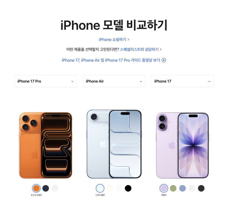 근데, 왜? 아이폰 에어인가?라고 생각하실 수 있을 겁니다. 당연히 교체 대상으로 어떤 폰이 좋을지? 아래와 같이 아이폰 17 프로, 아이폰 에어, 아이폰 17을 놓고 세세하게 스펙들을 살펴보면서 장여사에게 어떤 폰이 적합할지? 고민고민하고 있었는데, 어느 날 매장에 들러서 장여사가 직접 눈으로 보고, 손으로 만져도 보고, 가격도 확인하더니, 아이폰 에어가 좋아 보인답니다. 그럼 끝난 거지요.