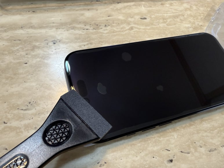 아이폰 에어를 바닥에 놓고 작업하면 예기치 못한 스크래치나 손상을 가져올 수 있기에 위에 패드를 받쳐두고 그 위에 아이폰 에어를 올려서 작업을 하시면 좀 더 안심하고 작업할 수 있을 겁니다.