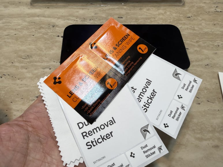 그리고 청소도구들 확인하시고, 역시 보호필름 2P 니까 청소 도구도 2P 제공되는군요. 알코올 솜으로 깨끗하게 청소하고 먼지 제거 스티커로 확인 사살하고...
