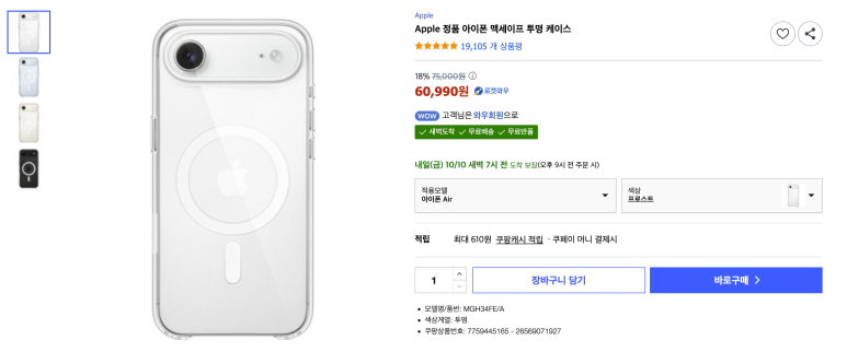 장여사를 위한 아이폰 에어 주문하면서 동시에 케이스와 보호필름도 주문을 넣었습니다. 다행히 네이버 애플 스토어에 아이폰 에어가 재고가 있어서 인지, 바로 다음날 도착이 가능하다고 되어 있더라고요. 그래서 케이스랑 보호필름도 쿠팡에서 모두 다음날 도착 가능한 제품으로 선택해서 주문 넣었습니다.
