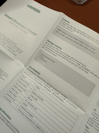 찌그러진 패키징 박스지만... 그래도 봉인 스티커는 온전히 붙어있습니다. 뒷면에는 제품 스펙에 대한 내용도 보이고, 모델, 넘버 등의 정보들이 있습니다. 뭐, 중요치 않습니다. 블루투스 방식 5.2 지원하고 배터리도 에어태그랑 동일한 CR2032 사용하나 봅니다. 대략 12개월이니까 1년은 사용하겠네요. 에어태그랑 동일한 듯?