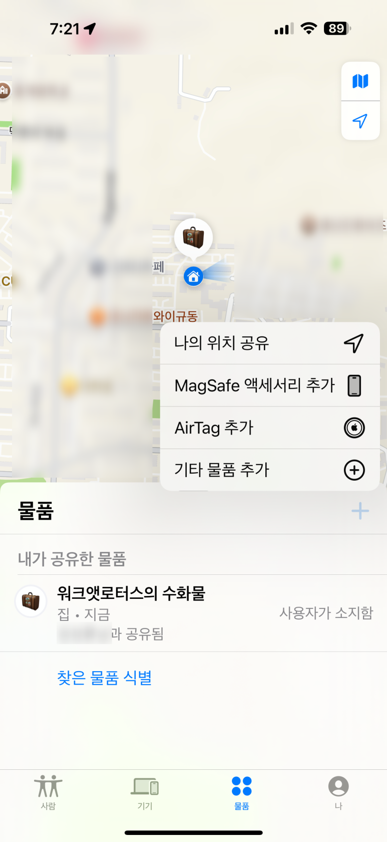 그럼... 지금부터 하나씩 단계를 따라서 추가해 보도록 하겠습니다. 앞에서 비닐은 제거하였고, 소리도 확인하고... 아이폰에서 나의 찾기 앱을 실행하고... 에어태그 추가가 아닌 기타 물품 추가 메뉴를 누르면 됩니다.