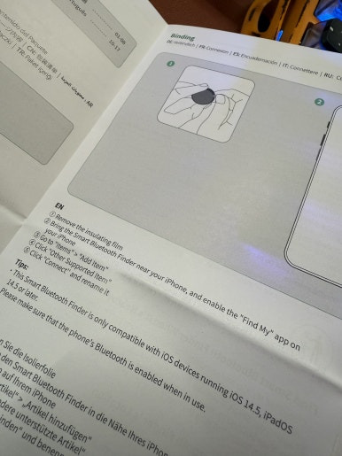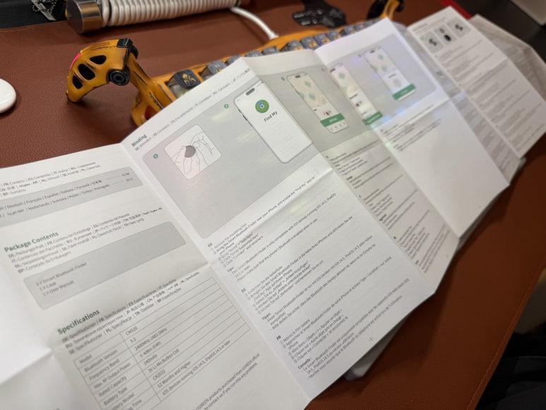 설명서가 내용이 잔뜩 적혀있습니다. 그림으로 봐서는 배터리 교체하는 방법도 있는 거 같고, 처음 작동시켜서 아이폰에서 물품 추가하는 방법도 설명하는 거 같습니다. 안타깝게도 한글은 보이질 않습니다.