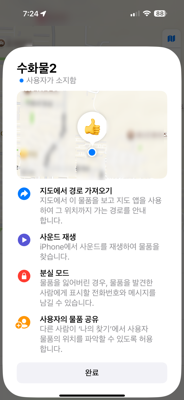 그래서... 취소하고 다시 동일한 과정을 진행하였습니다. 신기하네요. 이번엔 아무런 문제 없이 추가가 되었다고 나타납니다. 처음 진행할 때랑 달라진 건 아무것도 없는데, 두 번째에는 성공하였습니다. 애플 에어태그랑 동일하게 지도에서 경로 가져오기, 사운드 재생, 분실 모드, 물품 공유 등의 기능을 사용할 수 있다고 알려줍니다.