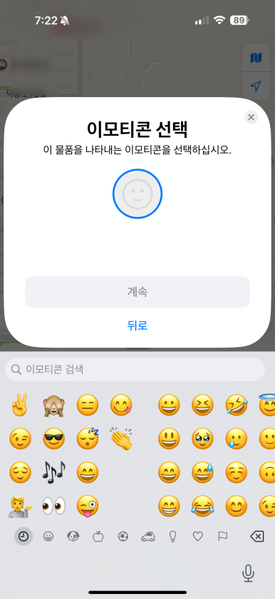 SmartTag 인식된 거 확인하고 연결 누르고 이모티콘을 하나 지정해 주고 에어태그와 동일하게 애플 계정과 연결되어 있다고 알려주네요. 여기까지 진행되길래... 문제가 없는 줄 알았습니다. 다 끝난 줄 알았는데...