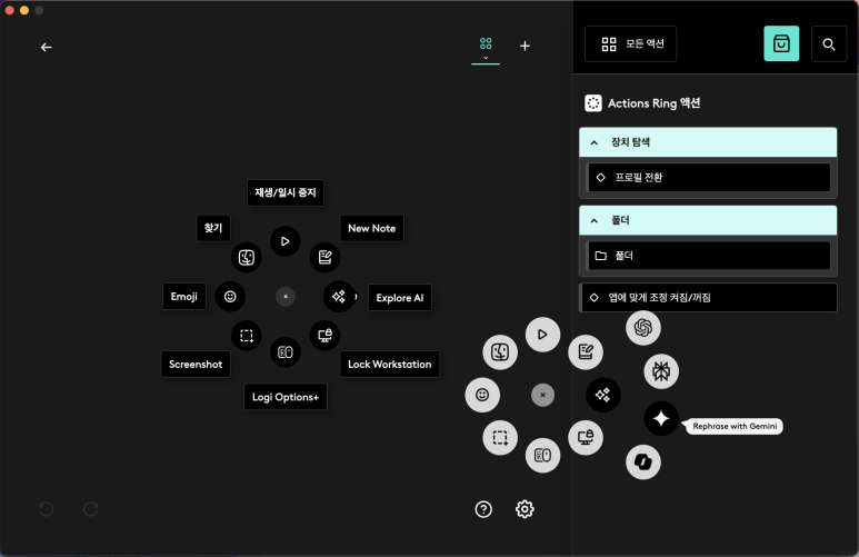 Actions Ring에 개별 기능들을 얼마든지 매핑할 수 있고, Actions Ring이 열리면 마우스로 원하는 기능을 선택해서 실행함 면 됩니다.