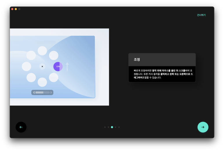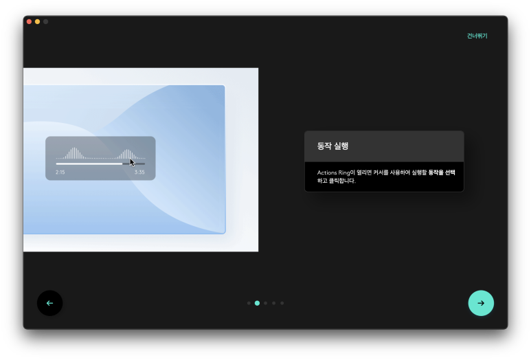 이후부터는 마우스가 어디에 있건, 엄지손가락 버튼을 누르게 되면 요렇게 화면 상에 Actions Ring이 표시가 되고 원하는 기능을 선택해서 실행하시면 됩니다.