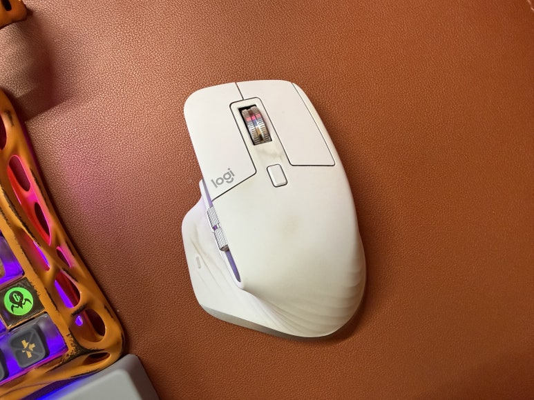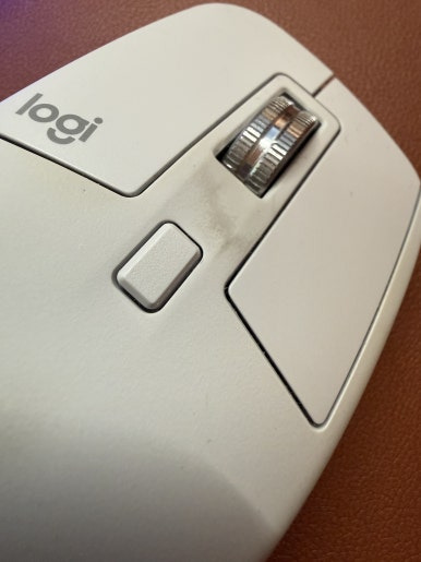 이넘의 고질병이라고 해야 하나요. 이전에 MX Master 3를 사용할 때는 블랙 색상이라 이렇게 때가 타는 모습을 눈으로 확인을 못하고 사용하였는데, 요거 3S는 화이트 기반이라, 얼마 사용하지 않았지만 요렇게 벌써 엄지손가락 부분과 휠 주변으로는 저 모양입니다.