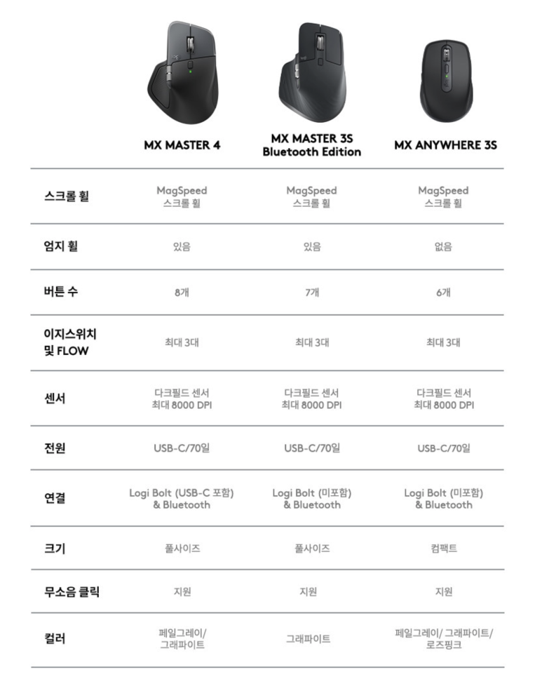 그럼에도 자꾸만 MX Master 4에 관심이 가서 이거저거 기능도 비교해 보고 차이점에 대해서도 살펴보고 있습니다. 판매 페이지에 요렇게 기능 비교표가 있더라고요. 3S vs. 4를 놓고 보면, 잉? 생각보다 크게 차이가 없는 거 같아요. 물리적으로 사이즈가 조금 커진 거랑 버튼이 1개 더 늘어났고,