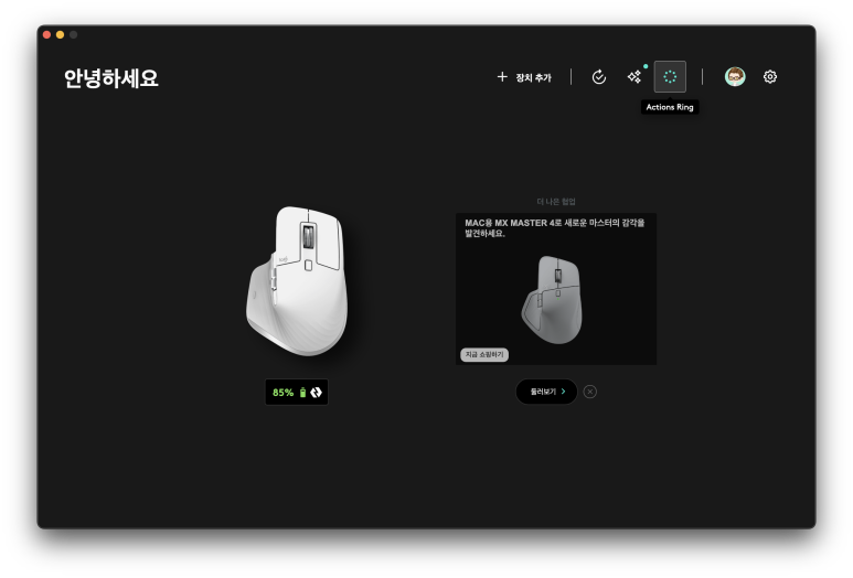 어라? 근데, 이게 무슨 일입니다. 분명히 저는 MX Master 3S를 사용 중인데, Logi Options+에서 상단 오른쪽에 Actions Ring이라는 메뉴가 보입니다. 뭐지? 이게 지원되는 건가? 눌러봅니다.