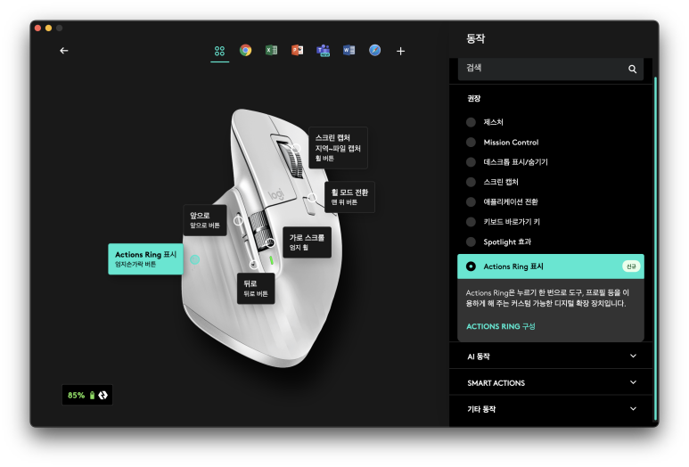 매핑을 어디서 하느냐? Logi Options+ 화면에서 동작 매핑하는 부분에서 Actions Ring 표시 기능이 신규로 추가된 거 보이시죠. 이거 선택해서 엄지손가락 버튼에 매핑을 해주시면 됩니다.