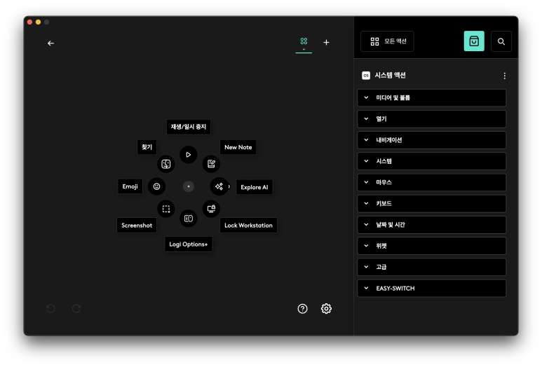 요 화면을 보는 순간, 이건 그냥 소개하는 게 아니라 실제로 진짜로 Actions Ring 기능을 MX Master 3S에서도 사용할 수 있다는 확신을 가졌습니다. Actions Ring 주변으로 여러 가지 기능들을 설정, 변경할 수 있도록 하더라고요.