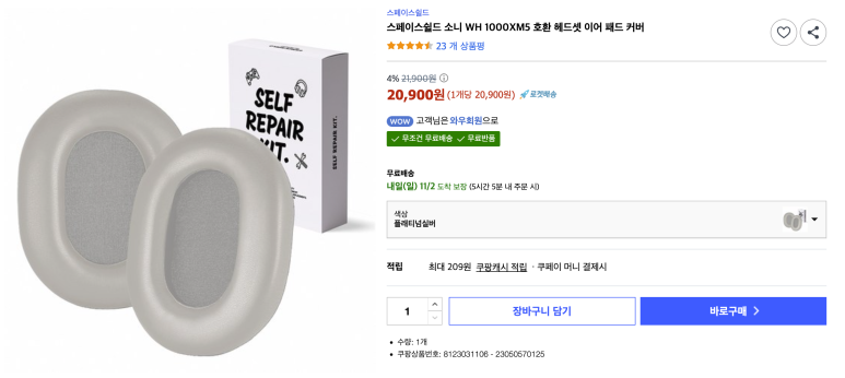 그렇다고 최근 새로 나온 소니 헤드폰을 사자니 가격이 너무 비싸고, 중고로 이전 세대 헤드폰을 구입하자니, 시간이 부족하고... 그래서 궁여지책으로 인터넷을 뒤져보니 헤드폰 이어 패드만 교체하는 게 가능하더라고요. 그래서 다음날 도착 가능한 쿠팡 로켓 배송으로 주문을 넣었습니다.