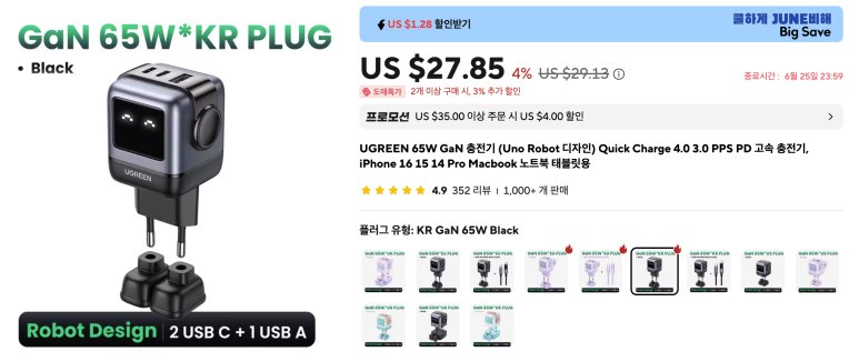 내돈내산 알리익스프레스 세일 유그린 로봇 디자인 고속 충전기 어댑터 인증샷