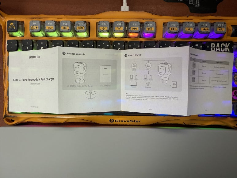 그러다가 이번 할인 이벤트에 가격이 많이 착해 보여서 눈 딱 감고 질렀습니다. 총 65W 출력이 가능한 로봇 디자인의 충전기 어댑터입니다. 측면에 주요 특징도 있네요. GaN 충전기 어댑터, 고속 충전 가능하고, 맥북 에어를 1시간 만에 70%까지 충전이 가능하다네요.