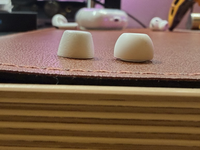 그럼 이제 본격적으로 폼팁에 대해서 자세히 살펴보도록 할게요. 사진에서 왼쪽은 컴플라이 폼팁이고 오른쪽은 에어팟 프로 3에 기본 제공되는 실리콘 이어 팁입니다. 일부러 이번에는 화이트 색상으로 맞춰서 하려고요. 이전에 블랙 색상은 너무 이어폰이랑 색상이 다르다보니 튀는 거 같아서...