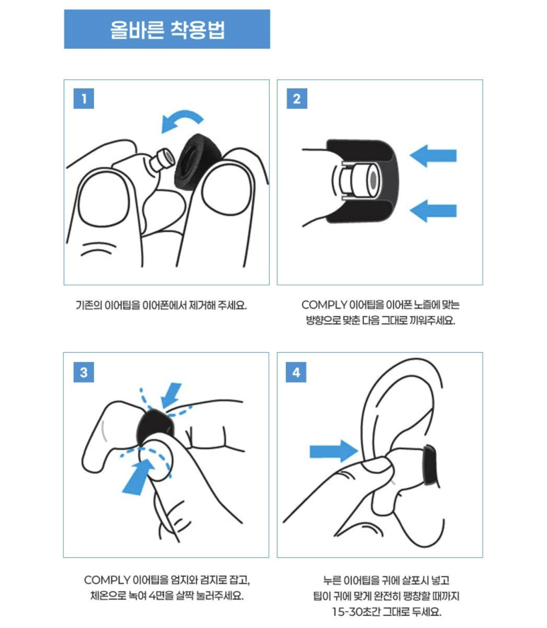 올바른 착용 방법이라고 요거 보고 따라 하시면 좋습니다. 다른 거보다 귀에 삽입하기 전에 사방으로 폼팁을 한 번씩 눌러주고 귀에서 팽창하면서 귀에 맞춰지도록 하는 겁니다.