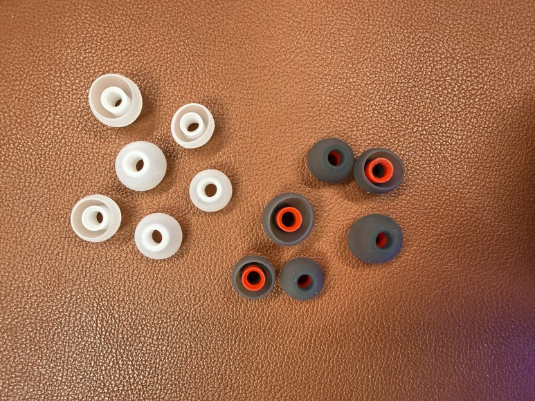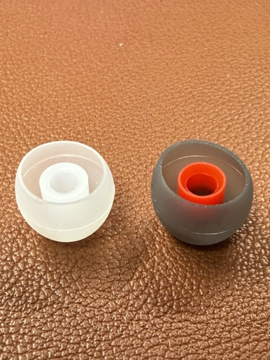 저는 동일한 사이즈에 다른 색상으로 왼쪽, 오른쪽에 착용해 보도록 할게요. 디자인 관점에서는 두 종류의 이어 팁이 전혀 차이가 보이지 않습니다. 다만, 손으로 만졌을 때나 귀에 삽입하였을 때 하얀색 이어 팁이 살짝 더 부드러운 느낌이라고 하면 얼추 맞을 거 같습니다.
